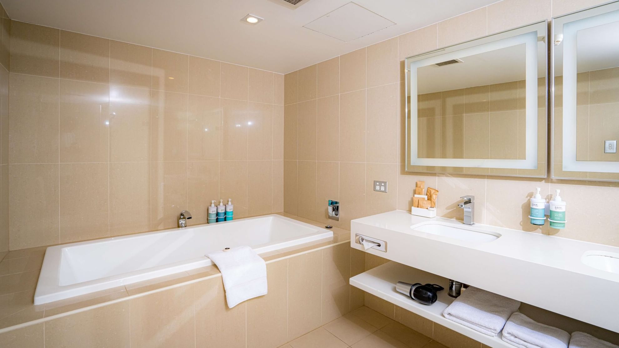Accommodating up to 2 adults and 2 children, this modern, spacious room is located on the higher floors and appointed with two Queen beds, sofa bed, work desk with connectivity panel, Wi-Fi connection, extra bathroom amenities, complimentary water & soft drinks, hair dryer and stylish coffee machine in the room.